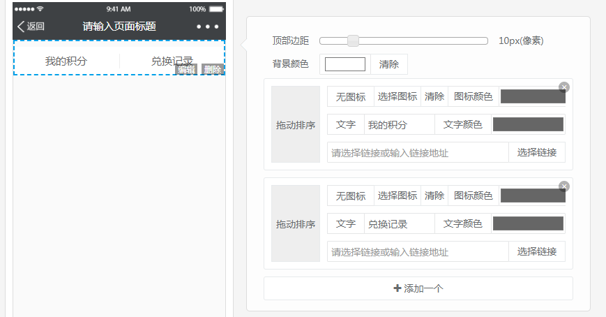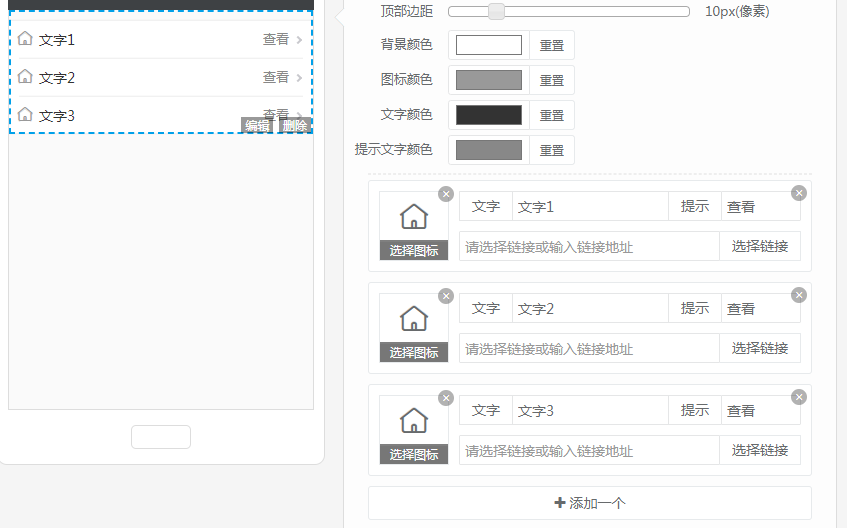 列表導航大多數情況下用在個人中心的頁面,是許多功能的入口,需要編輯列表標題、鏈接地址??梢蕴砑佣鄠€多個列表;也可以選擇不同的樣式,比如加不加圖標,加不加“查看”提示文字。