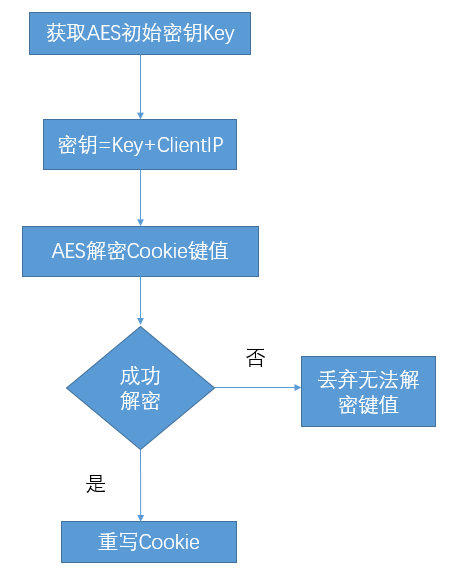 首先獲取AES的初始密鑰Key,接著判斷是否開啟客戶端IP綁定,是的話AES的密鑰為Key+ClientIP,不是則為Key,之后通過AES對(duì)Cookie的鍵值進(jìn)行解密,解密過程中判斷是否開啟安全模式,是的話將丟棄無法解密的鍵值,不是則保留鍵值,之后重寫整個(gè)Cookie