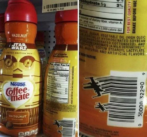 咖啡伴侶的條形碼,是想讓你喝過咖啡,興奮的想要飛起了嗎?給了架飛機的形狀條形碼。