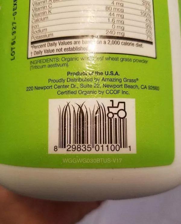 這是有機麥苗的條形碼,也是很神似的。這個與上面的剃胡刀的設計思路是一樣的,不過這個寓意更好,寓意著有機麥苗大豐收。