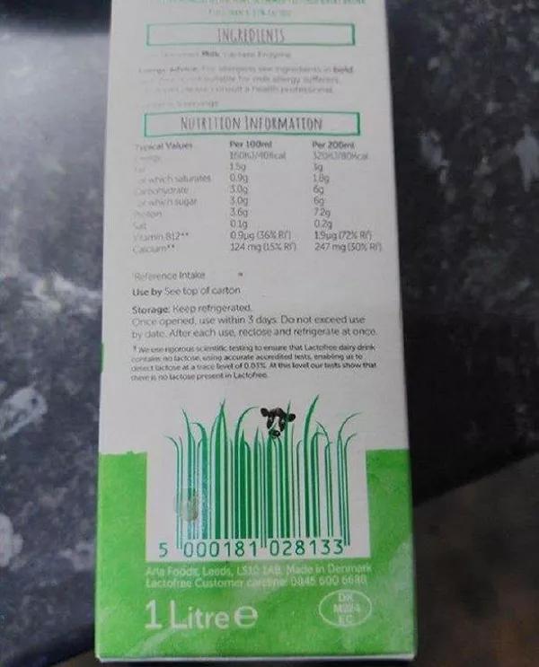 牛奶包裝盒的條形碼跟上面那個很像,不過這個說自己是牧草,也合乎牛奶的宣傳標語,后面還有一只小奶牛露頭。