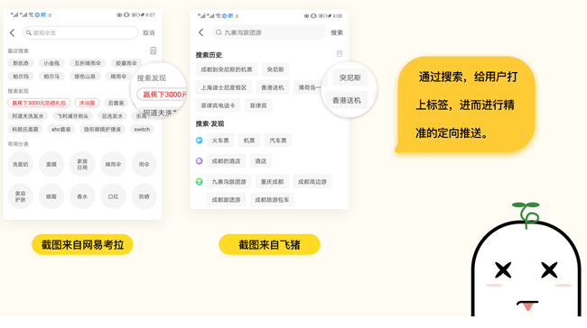 為用戶打上不同的標簽,用于區分不同用戶群體,分類精準定向推送產品,例如:考拉的搜索發現。