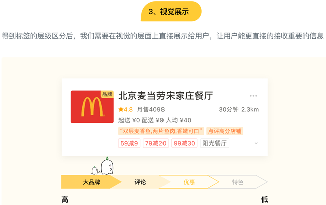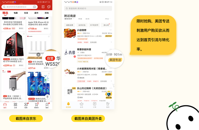 標簽還可用于吸引用戶注意,建立好感,直擊對應痛點,提升用戶購買欲,提高點擊率與轉化率,最終促使用戶下單。例如電商類型的限時搶購、京東自營、美團專送等。