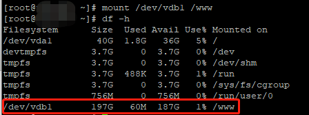 7、運行 mount /dev/vdb1 /www (或者mount-a)掛載新分區,然后執行 df -h 查看分區。如果出現數據盤信息,說明掛載成功,可以使用新分區了。
