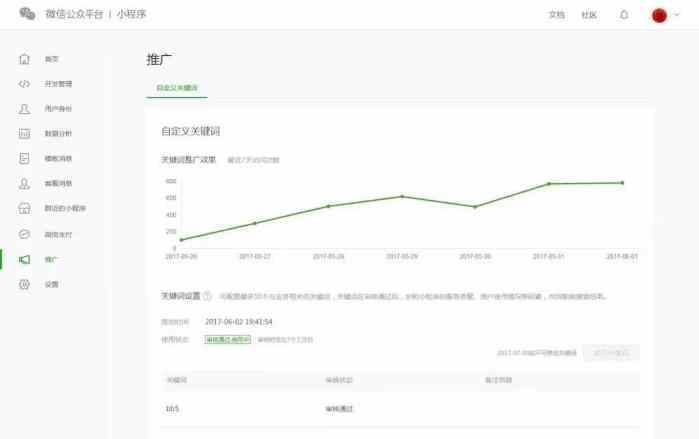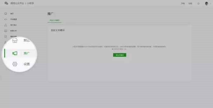 登陸小程序后臺后,進(jìn)入“推廣”-添加小程序關(guān)鍵詞,即可推廣。