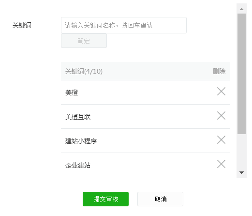 小程序可配置最多10個與業(yè)務(wù)相關(guān)的關(guān)鍵詞,支持每月修改三次,每次審核時間為七天。