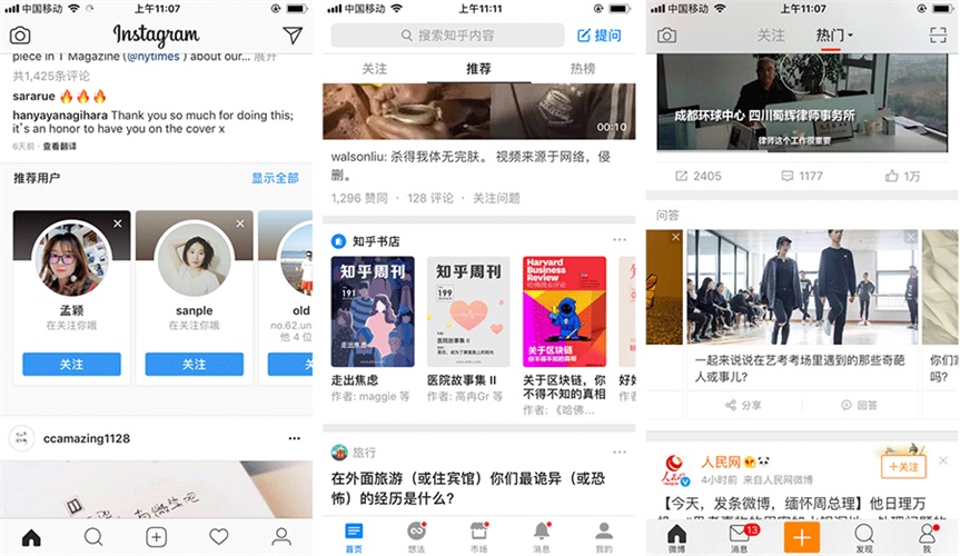 示例如下,分別是 Instagram,知乎,微博的首頁。