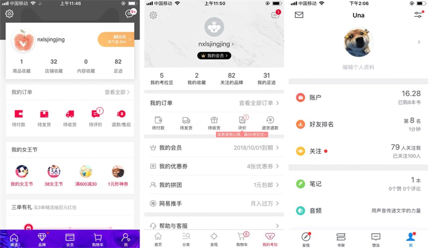 示例如下,分別是天貓,嚴選,微信讀書的個人中心截圖。