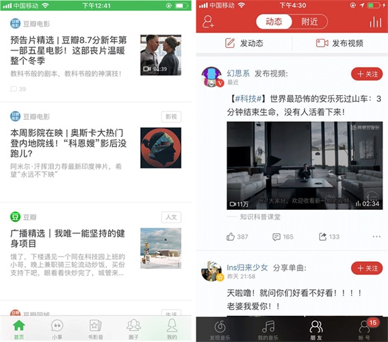 示例如下:分別是豆瓣的首頁,網易云音樂的動態截圖。
