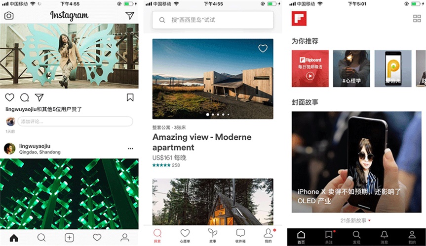 示例如下:分別是 Instagram,愛彼迎,紅板報的界面截圖。這些頁面中,均以圖片為主。圖片本身的邊緣具備分隔作用。