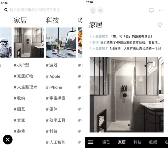 示例2:輕芒的「分類頁」和「類別首頁」,分類頁只有一種版式,并橫向排版展示。類別首頁只有一屏信息。