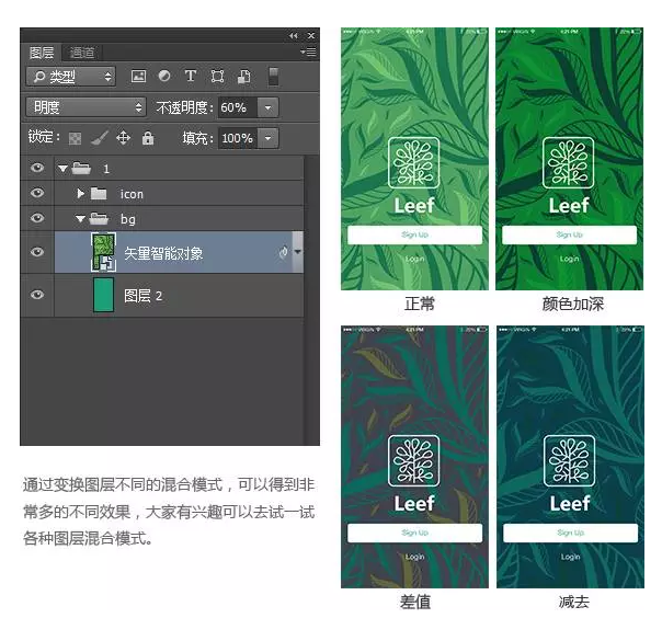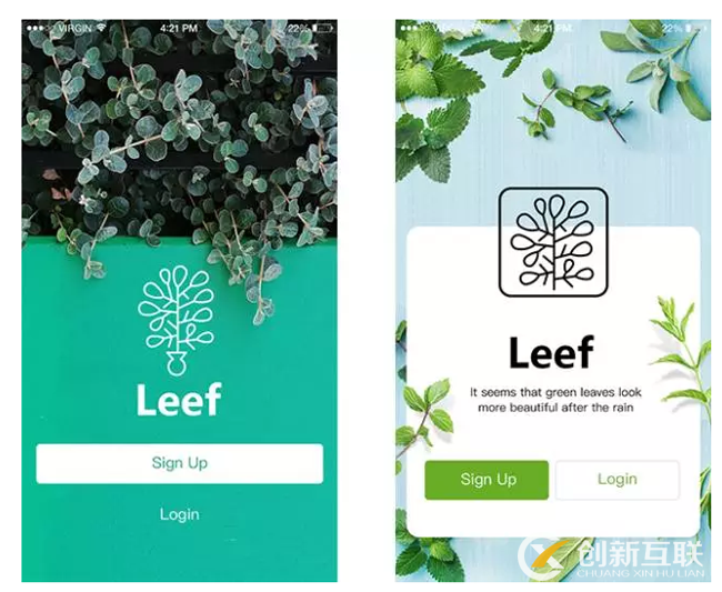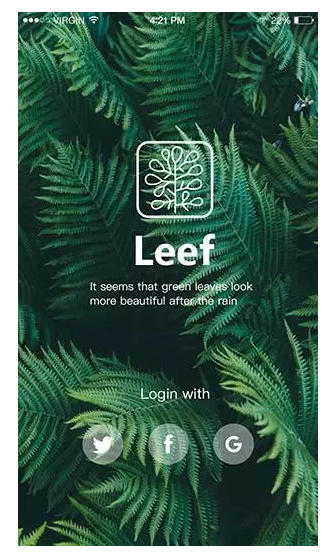 純色背景適合用反白的logo,那么,你需要設計一個有特點的線性或者剪影圖標。很多時候APP并沒有單獨設計文字名稱,這時候logo的標題字我一般選用非襯線粗體搭配。界面上的按鈕只有兩個,至于是突出注冊還是突出登錄。這個還是看產品人員的需求。因為不同應用對于登錄注冊的優先級理解不一樣。如果你的BOSS覺得這種極簡風格的背景太敷衍了。那么我們可以考慮加一些矢量的紋理。當然我們需要找綠葉元素的紋理。這樣才貼合主題。為了讓顏色更加貼合主色,我會把矢量的圖片去色,圖層模式并選用明度的模式。