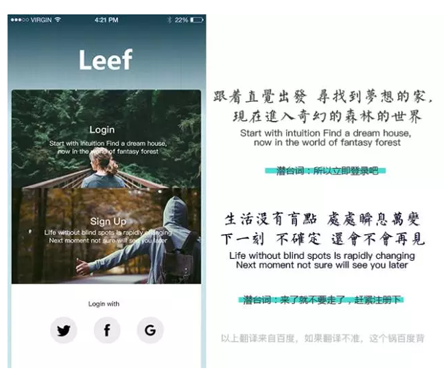 很多時候矢量紋理也許找不到合適的,或者厭倦了各種規則紋理,我們可以試著去尋找一些好看的圖片做為背景。一般選擇整體為暗調的圖片,這樣可以承托前景的按鈕,logo等元素。對于需要強調的按鈕可以用純白做底,需要弱化的可以降低白色底的透明度。如果圖片頂端顏色雜亂不利于線上電池欄,所以可以再加上一個綠色的半透明漸變。貌似按鈕下感覺有點空,那么我們可以配上一段有詩意的語句: