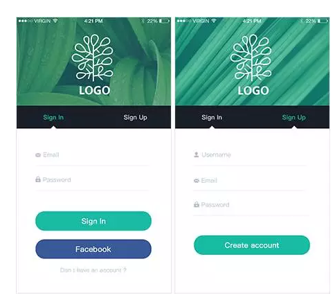 (1)登錄注冊分開的界面,切換時候上部背景圖片要有區別,區別中又要統一,所以共同選擇了紋理不一樣的局部特寫圖片,圖片綠色的顏色可能不一樣,所以共同疊加了同一種綠色,降低了透明度。讓界面圖片更加統一。