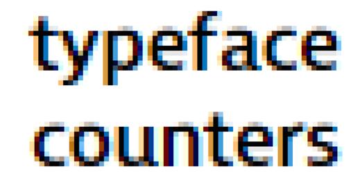 西文字體設(shè)計存在“External Counter”和“Internal Counter”的概念,通常稱之為外部空間和內(nèi)部空間。小寫字母 “a” 和 “e” 的字母內(nèi)部兩個空白區(qū)域即為內(nèi)部空間,如果某部分內(nèi)部空間比較小,當字體尺寸較小的時候,會降低識別度。諸如字母 “r” 和 “n” 則需要注意它們外輪廓的細節(jié)銳利度和那些勾勒細節(jié)的外部空間,也就是豎線和弧線之間所夾的空間。如果外部空間較小,在字母間距較小的情況下”rn” 和 “m” 就很難分辨了。