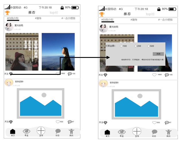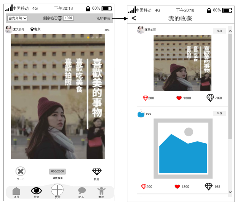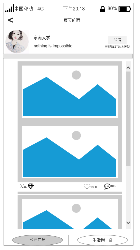 如果產(chǎn)品能順利進(jìn)入成長(zhǎng)期,我會(huì)設(shè)置兩個(gè)“朋友圈”,如下圖,一個(gè)叫公共廣場(chǎng),也就是你發(fā)的作品會(huì)被人投資,也有可能上首頁(yè),所有的人都能看到;另一個(gè)叫生活圈,只有互相關(guān)注的好友才能關(guān)注生活圈,有助于私密關(guān)系的誕生和沉淀。