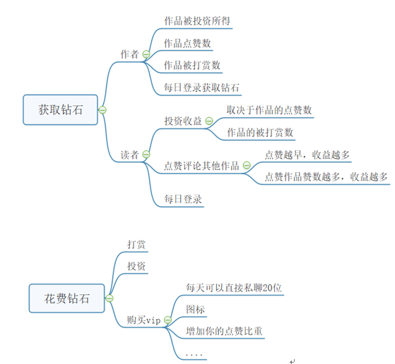 讀者可以通過(guò)投資作品,成為該作品的擁有者(股東),如果作品進(jìn)入推薦榜,那么用戶對(duì)它的點(diǎn)贊,打賞都會(huì)給股東回報(bào),也就是你投資的作品越熱門,你獲得的鉆石越多。這是游戲化的核心,弱競(jìng)爭(zhēng)性+互動(dòng)性。