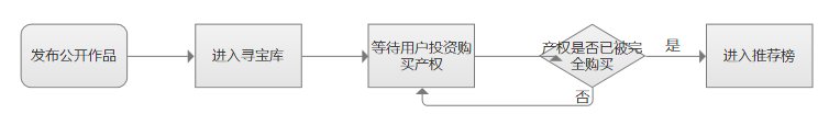 也就是一個(gè)作品最多只有4個(gè)股東,最少有兩個(gè)股東(保證作品的質(zhì)量),當(dāng)該作品的原始股份被全部購(gòu)買后,作品會(huì)進(jìn)入首頁(yè)的推薦,而不會(huì)在尋寶這個(gè)板塊里面出現(xiàn),作品的轉(zhuǎn)移路徑如下圖所示:
