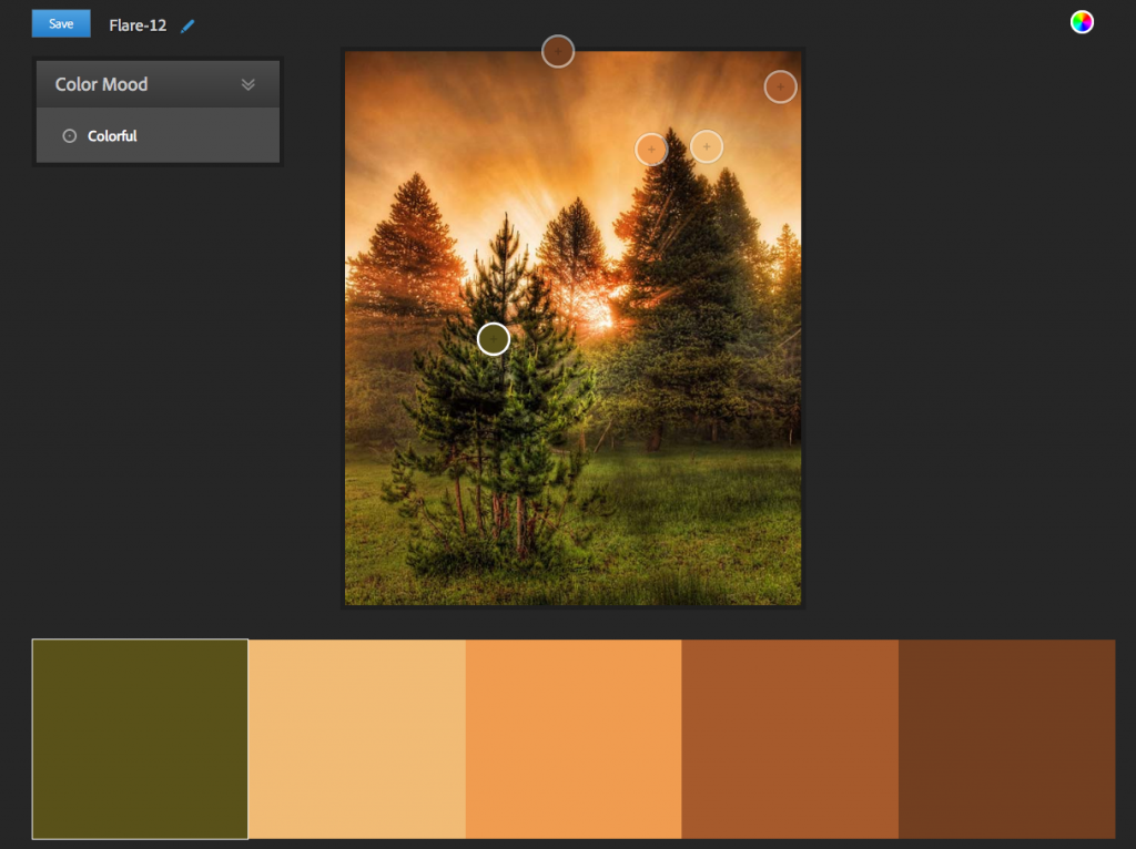 從這個案例可以看出,Kuler的確生成了一套不錯的土黃色配色方案。我尤其喜歡Kuler中的圓圈兒拾色器,當你在圖片中拖動它的時候,調色板會實時地調整整套配色方案。當你點擊想要調整單個的顏色的時候,拾色器將會繞過明亮的白邊,選取更符合整體風格的顏色。最后,容我再贊一次Kuler!它的確是一款相當不錯的取色工具!