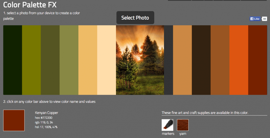 Color Palette FX也是一款”簡單粗暴”的軟件。單擊”Select Photo”按鈕選取照片,然后軟件會自動生成配色方案,結果如下。Color Palette FX會從照片中抓取的色域非常寬,并且會賦予每個色彩一個名字,這一特色深得我心!