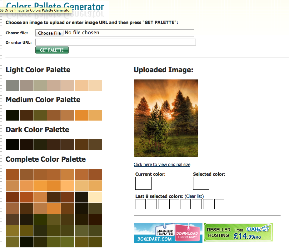 CSS drive有一個被稱為Color Pallete的調色生成器。同樣的,你需要點擊”Choose File”按鈕來選取照片,按下”GET PALETTE”生成配色。通ColourLover一樣,它會生成多個方案,并且通過柵格來展示取色點。結果如下。