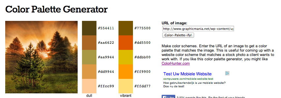 通Photocopa一樣,Color Palette Generator僅僅只能處理帶url的網絡圖片,如果你選擇這款工具的話,你同樣需要上傳本地圖片到網絡上,才能讓其為軟件所用。有了url之后,點擊”Color-Palette-ify!”按鈕,配色方案就到你碗里了!有意思的是,它生成的配色方案不是單單依據光暗生生成單獨一套,它會為你提供”沉悶”和”活力”兩套配色方案。也許我的案例中的生成結果不算太理想,但是它可能非常適合于你哦~