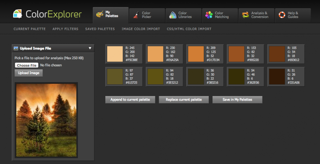 ColorExplorer的操作與之前的幾款軟件也大同小異,不過你要導入照片的話,需要要在”My Palettes”菜單下找到”Image color import”按鈕來導入圖片。如下圖,你需要在左側點擊”choose files”按鈕來選擇照片,然后單擊”Upload Image”來上傳照片。之后,右側會出現生成的配色方案。值得一提的是,在圖片的下方,你可以選擇軟件解析圖片的方式,從粗糙到精細一應俱全,非常有意思。