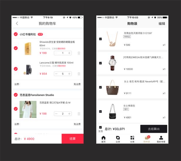 小紅書:沒有那么強調購車這個屬性,因為小紅書屬于口碑分享精準推薦類的社區,她的定位側重在用戶ugc和分享,并從而讓其他用戶對這些優質的內容進行購買轉化,通過其他用戶的分享評價和使用心得和大數據的精準跨境商品推薦,能夠很快幫助我了解我所想要的產品的優缺點還有是否適合自己, 所以購物車并不是那么重要,社區類的電商也帶有一定屬性的社交,所以購物車使用的場景就沒有像淘寶京東那么頻繁。