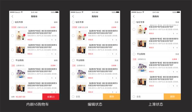 但是問題來了,我們的購物車是內嵌的h5頁面,我們需要將之前外露的刪除功能隱藏到編輯功能里,但是導航欄上的編輯功能無法實現編輯內嵌的h5頁面,所以和交互小哥哥的討論之后,我們決定將編輯分別放在幾個模塊上,只要點擊其中一個編輯就能編輯所有商品,點擊完成既能恢復所有狀態,同時在頁面滑動的時候每個編輯欄都能在頂部置頂。這樣就解決了h5頁面編輯功能的尷尬,當然我們還是期望能夠做成原生: