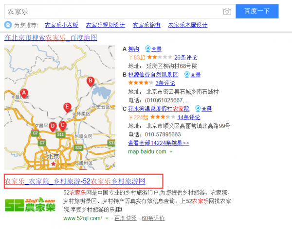 4.將列舉出來最重要的用戶需求組合成一句通順的話,如果有吸引性元素,能夠吸引點擊更好。 現在我把上面那個農家樂的例子重新拿到這里,根據農家樂這個搜索詞的用戶需求和網站定位,我會建議把52農家樂網的網站標題改為:農家樂預定價格_農家院推薦排名_農家樂免費入駐-52農家樂網。鑒于我語文水平有限,我能想到的也只能這樣了,有興趣的朋友可以研究一下我為什么會這樣建議標題,也可以提出自己認為更好的標題來和我交流。
