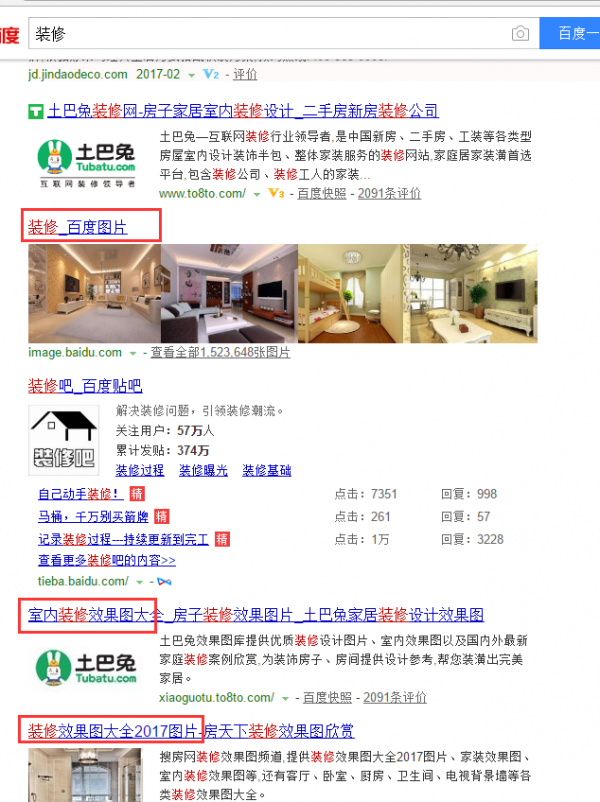 其實網站包含核心詞是沒有問題的,但關鍵是我們怎么在包含核心詞的同時還能讓標題合理、舒暢,同時滿足用戶和搜索引擎的需求,這說起來容易,做起來還是需要一定的練習和實踐經驗的。 首先,我們要知道的是,我們寫標題是為了給用戶看的,用戶在搜索相關的關鍵詞時,我們的網站標題能夠展示出用戶迫切需要的東西才是一個好標題最重要的部分。這里我拿裝修行業來舉個例子,熟悉這個行業的朋友都知道,在百度上搜索裝修這兩個字的人有很大一部分都是想看效果圖的,用戶也許不會直接在搜索引擎中輸入成都裝修效果圖”,但是我們一定要清楚用戶想要看的是什么。我們在成都裝修”一詞的搜索結果中也能清楚的看到這一點,幾乎排在百度首頁的所有網站標題中都會有成都效果圖”這一點。