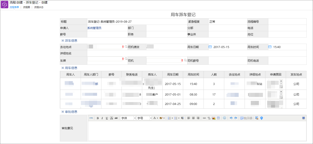 車輛管理員進行車輛排出登記,審批通過之后自動形成出車記錄臺賬。
