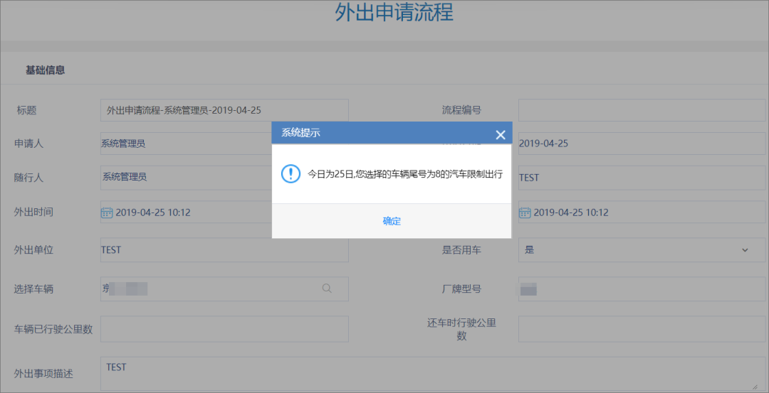 泛微OA系統通過建模,搭建“限號規則表單”,并且在用車流程增加相關字段。在提交用車流程時,根據時段對限行車輛給出提醒。