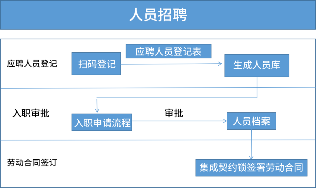 若是該人員確定入職,可觸發“新員工入職申請流程”,并將登記表部分信息帶入“新員工入職申請流程”,入職審批通過后集成契約鎖簽訂電子勞動合同,同時在人事管理模塊建立人員檔案。