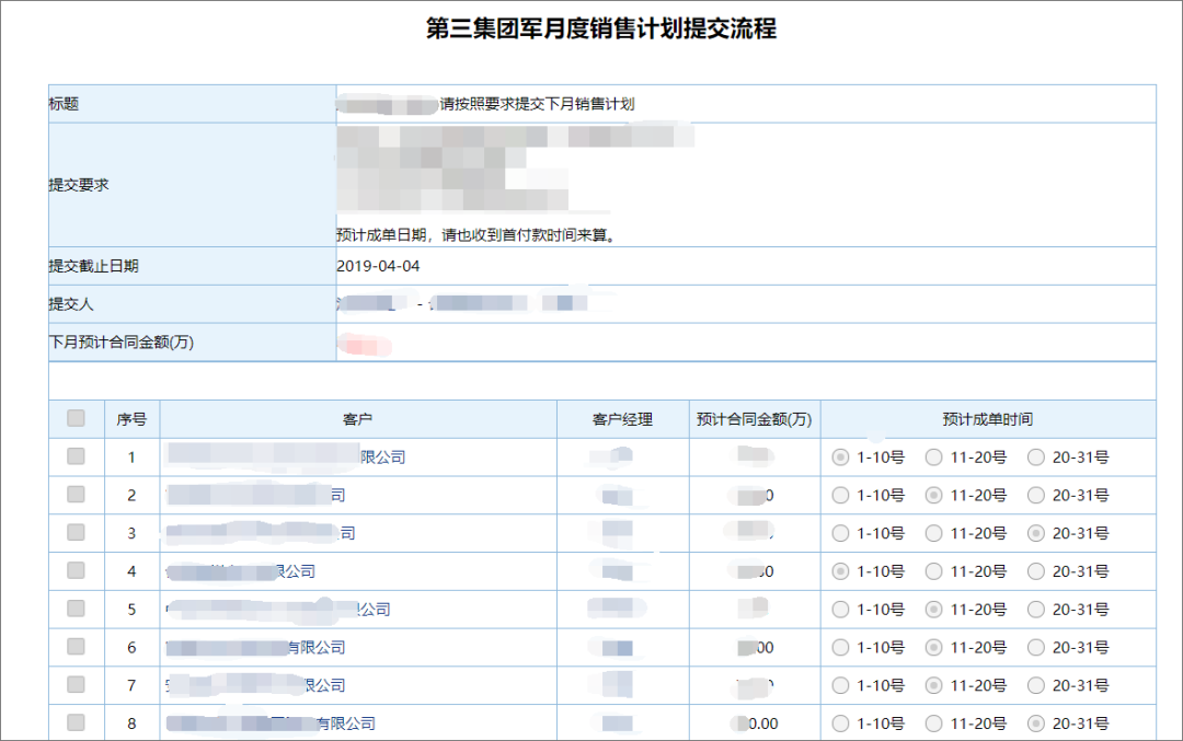企業需求背景: 為更精準地預測即將成交的商機,一些銷售類企業會要求各大區、各區域及每個銷售人員預估上報下月可能成交的銷售機會,為了提高上報效率和分析效率,不少企業選擇了通過信息化系統進行上報。