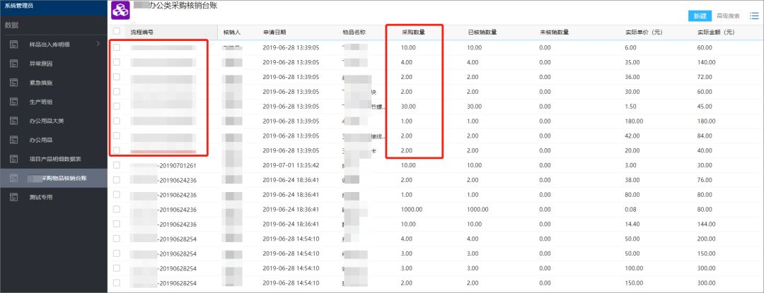 采購人員在OA發起采購申請,流程歸檔生成采購物品臺賬,記錄各物品未核銷數量;