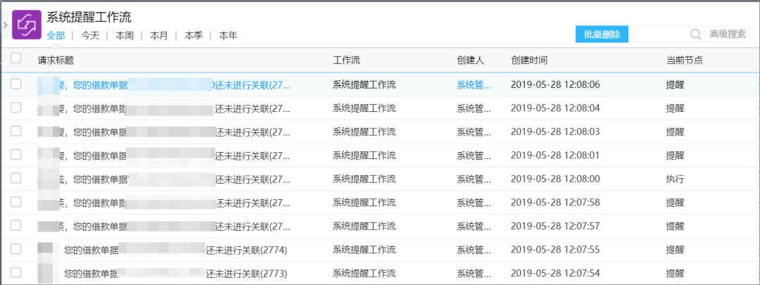 在后臺配置好提醒方式后,系統會自動觸發一條提醒工作流,發送到借款人待辦中,提醒該員工盡快進行報銷辦理。