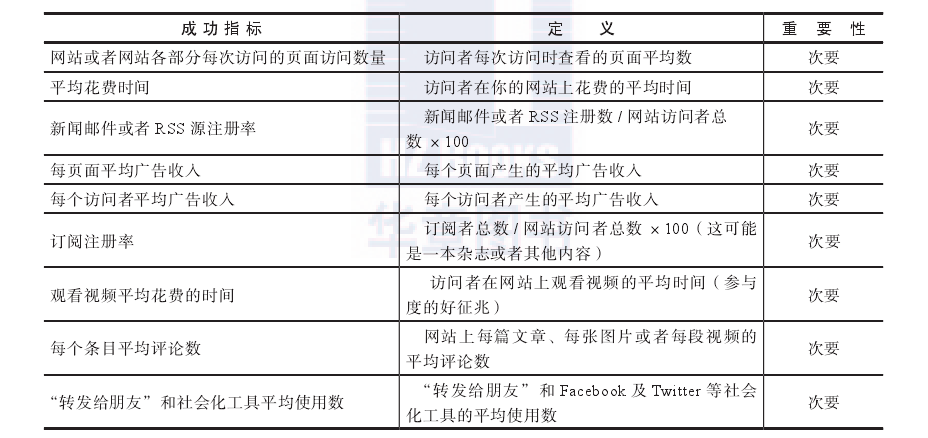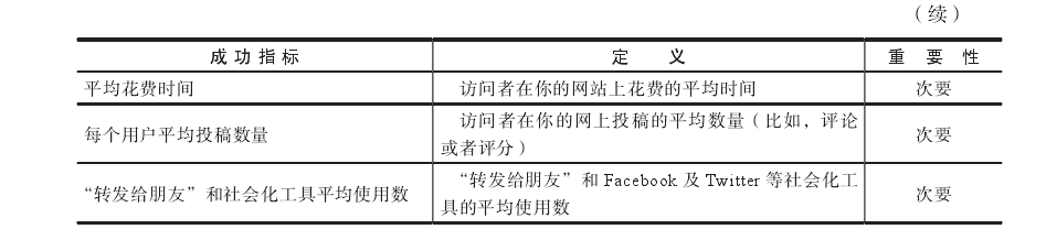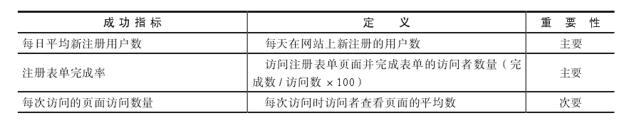 在下面的成功指標(biāo)表格中,找到與你的網(wǎng)站最相符的類(lèi)型,記下你需要設(shè)定基準(zhǔn)和監(jiān)控的主要和次要關(guān)鍵成功指標(biāo)。這能夠讓你在理解需要監(jiān)控和改進(jìn)的成功指標(biāo)方面一步。在理想的情況下,你應(yīng)該嘗試和改進(jìn)所屬網(wǎng)站類(lèi)型的各種成功指標(biāo),而不只是其中的兩個(gè)。