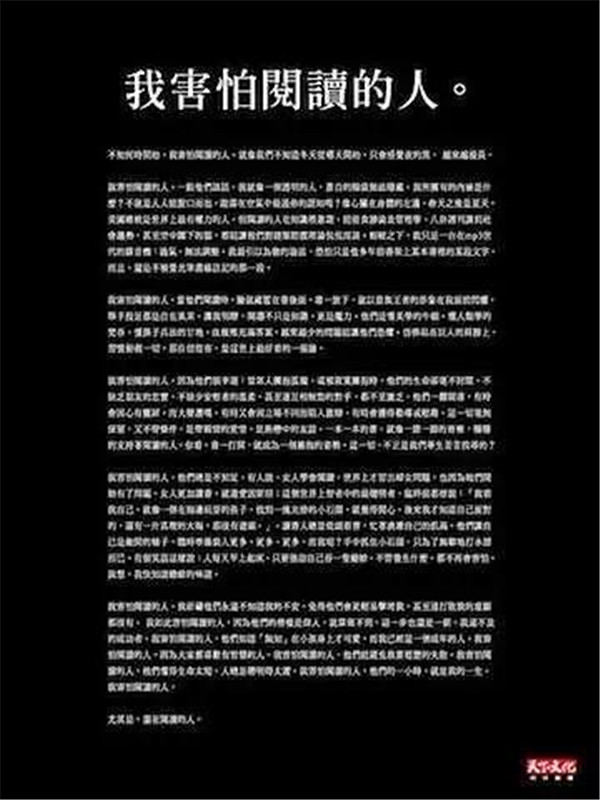 經典文案《我害怕閱讀的人》就是通過第一人稱“我”,給讀者娓娓道來。