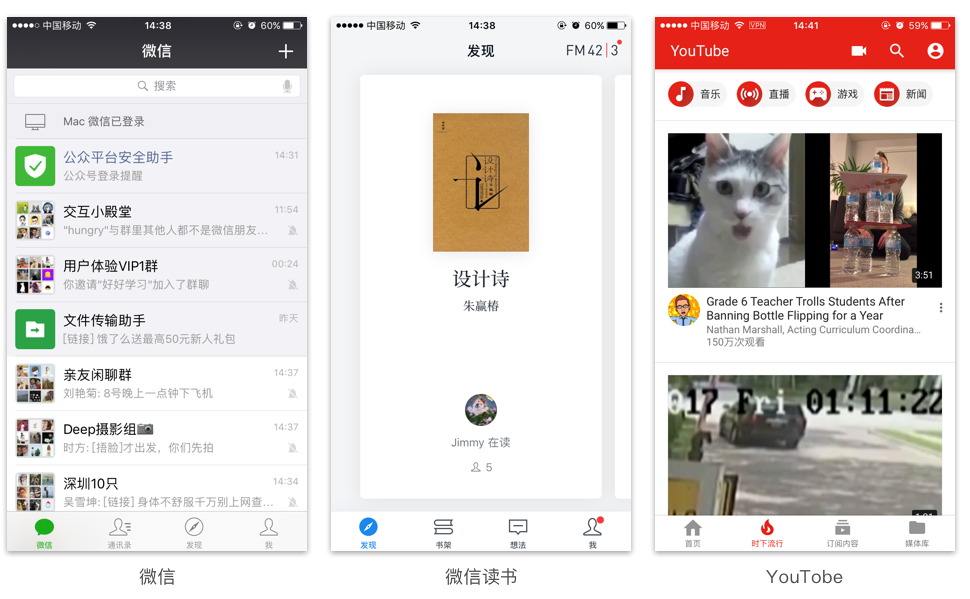 2. 標(biāo)簽欄占用了一定的空間,所以減少了頁面的信息承載量,有點(diǎn)產(chǎn)品為了更好地展示頁面信息,會(huì)使用一種隱藏的標(biāo)簽欄,這種標(biāo)簽欄會(huì)在用戶上滑閱讀時(shí)隱藏,下滑返回時(shí)再顯示。這種做法確實(shí)照顧了頁面的信息展示,但是也要具體產(chǎn)品慎重看待,因?yàn)樗赡軙?huì)讓導(dǎo)航失去便捷性從而降低切換效率