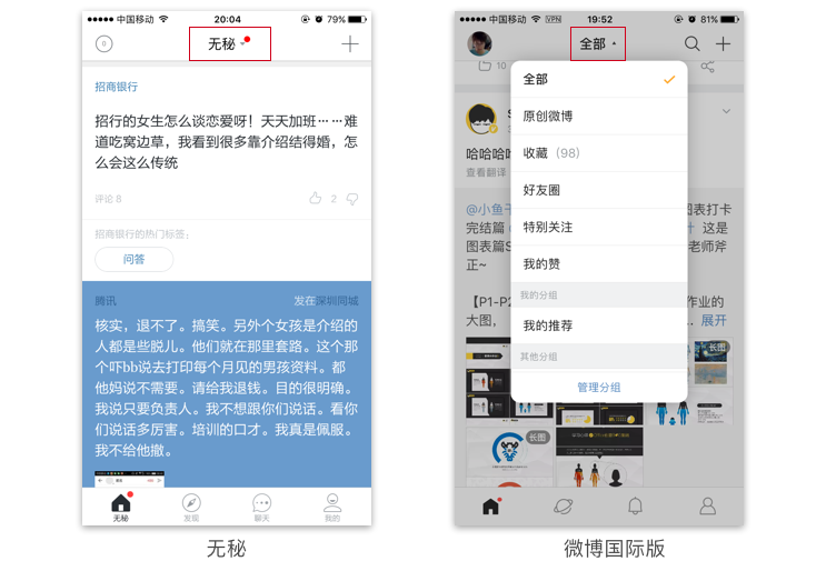 微博國際版和無秘的二級導(dǎo)航都采用菜單式導(dǎo)航的形式。