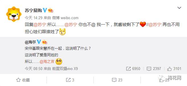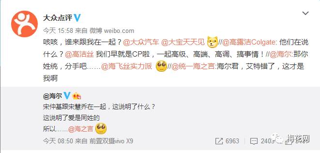 反應最快的要屬海爾了。海爾立馬get到了宋仲基和宋慧喬同姓的點,迅速發微博@和自己同姓的品牌,強行組CP。