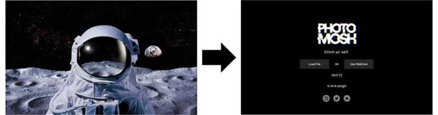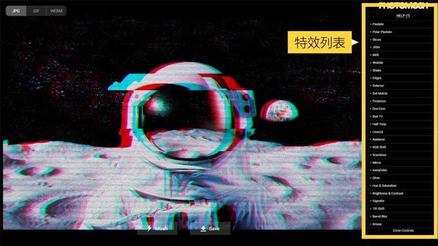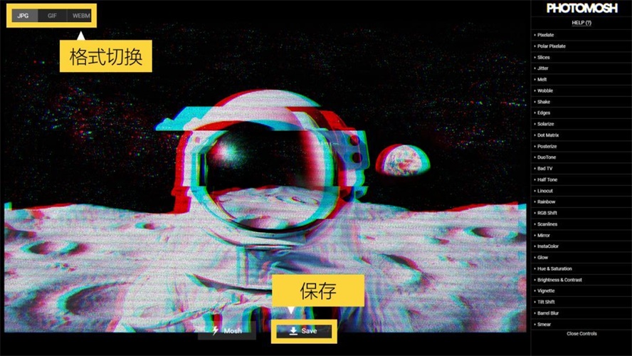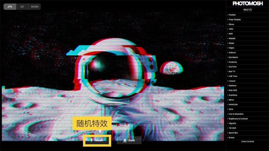 PhotoMosh 一共提供了27種故障特效,如果你有選擇困難,點擊下方的隨機按鈕「MOSH」就能一鍵把你的屏幕摔壞啦: