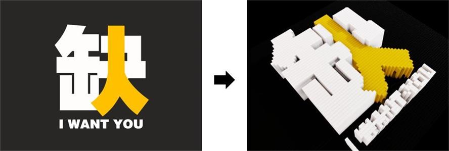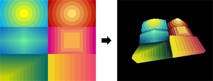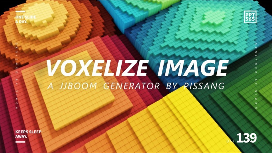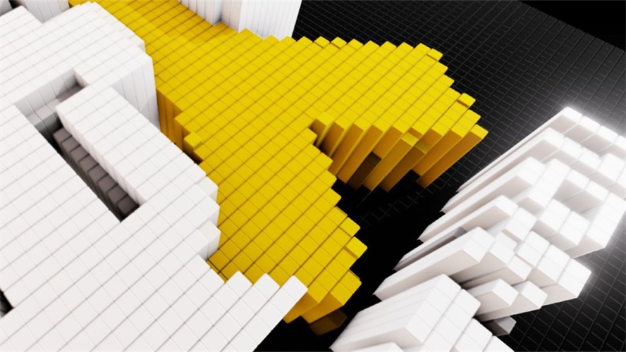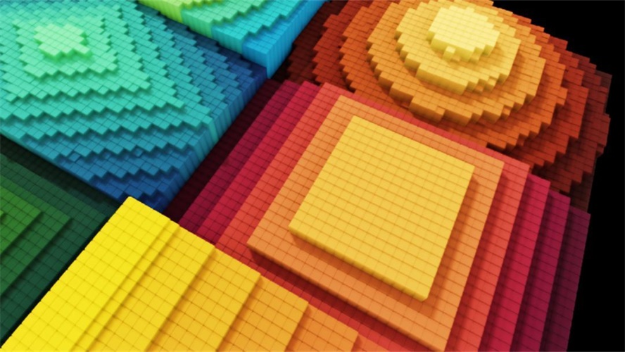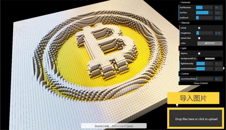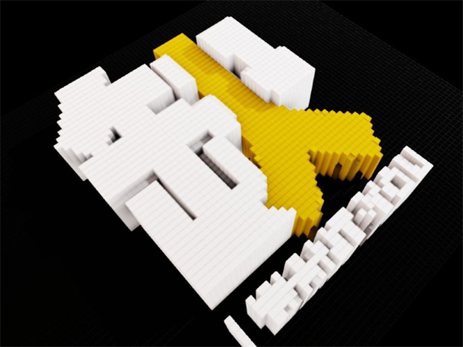 Voxelize Image 十分簡單易用,你只需要往右下角的方框拖拽一張圖片,它就會自動把圖片轉換成這種立體的體素效果: