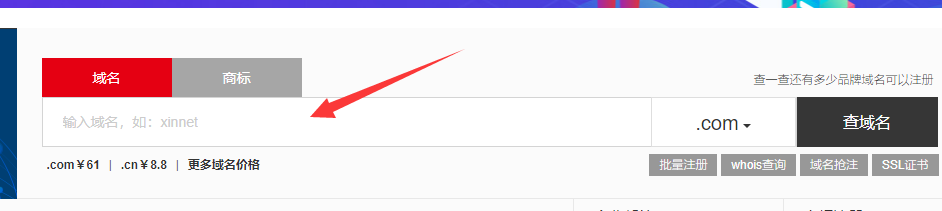 3、在域名注冊搜索框里面,輸入我們想要注冊的域名進行查詢;