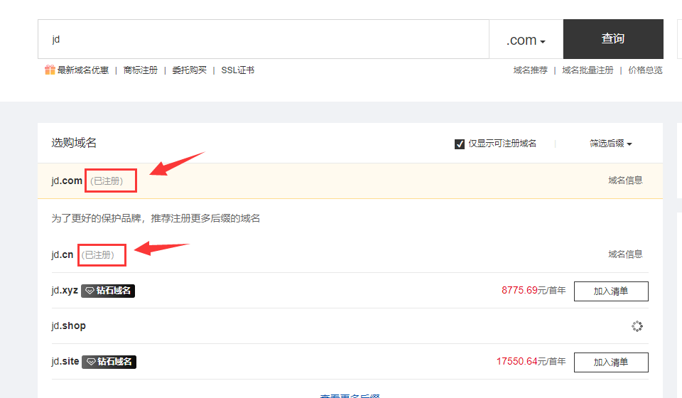 4、若是出現該域名已被注冊,則代表我們無法注冊該域名,我們要從新換一個新的域名進行注冊;