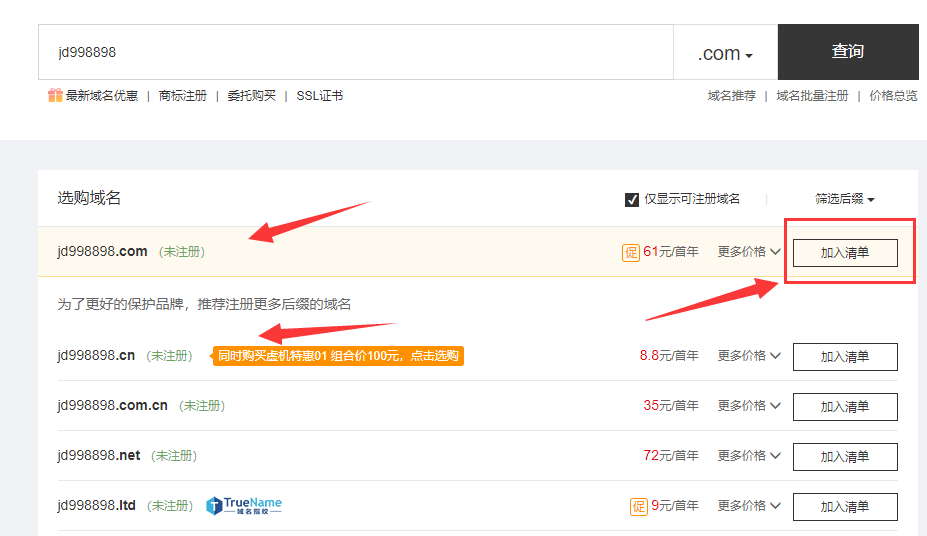 6、選擇自己心儀的未注冊域名,點擊右側“加入清單”,并進行新網賬號登錄(無新網賬號直接注冊一個即可);