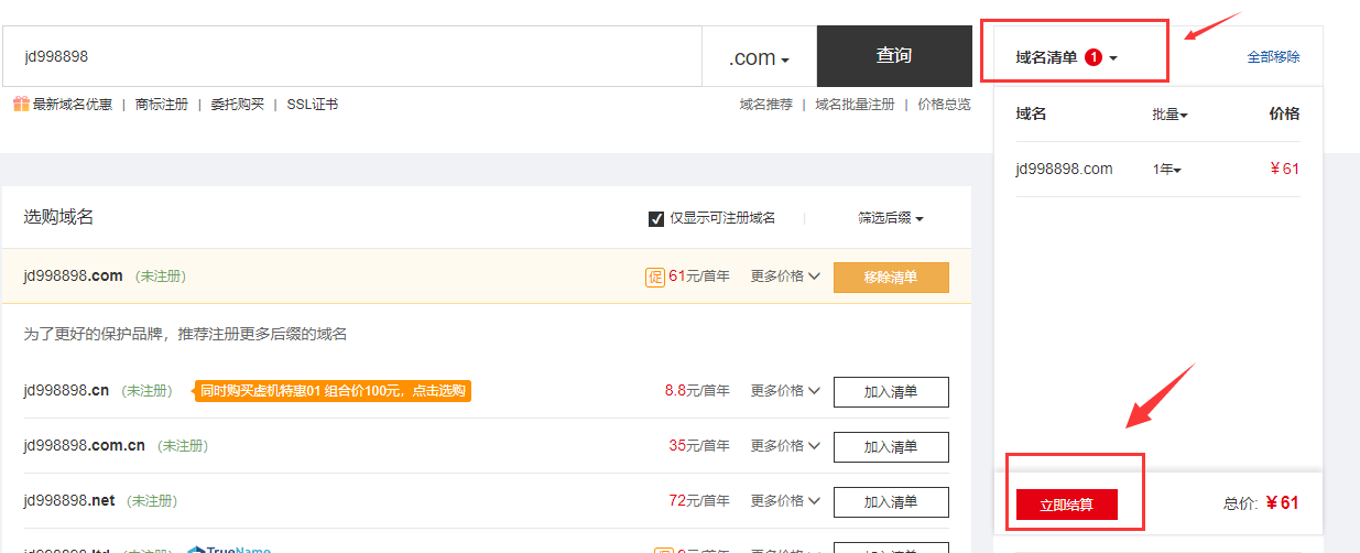 7、登錄賬號之后,可能需要重新點一下“加入清單”,這樣右上角就會出現“域名清單”,然后再點擊下方的“立即結算”,進入下一個頁面;