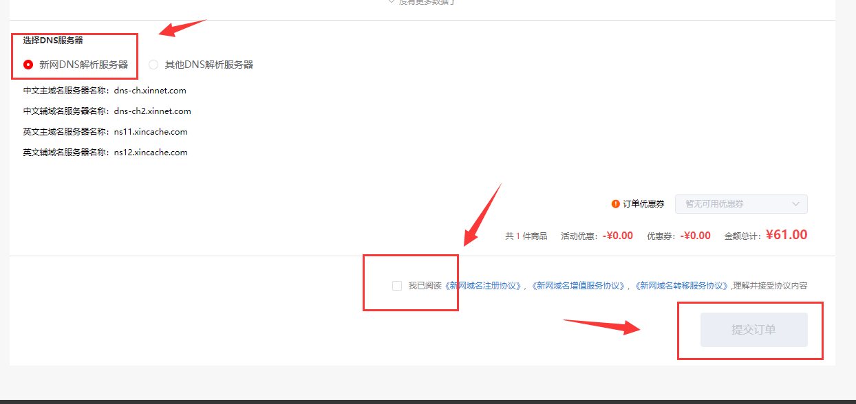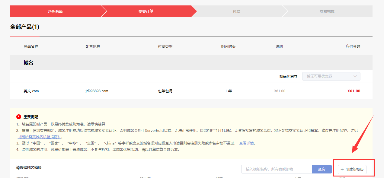 10、模板注冊好之后,勾選域名注冊模板,頁面下方的幾個選項正常勾選,就可以提交訂單,然后付款就可以啦。