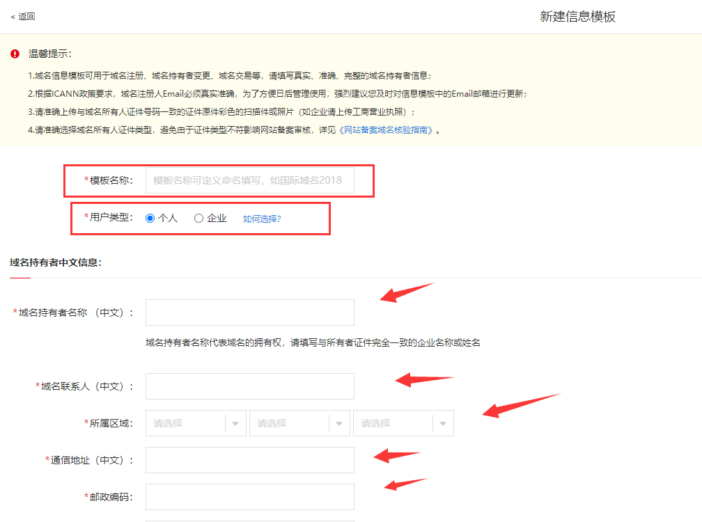 9、進入到創建模板頁面,根據要求填寫相關的信息,如果是個人,用戶類型就選擇“個人”,如果是企業,那就選擇“企業”,一項一項填寫就可以;